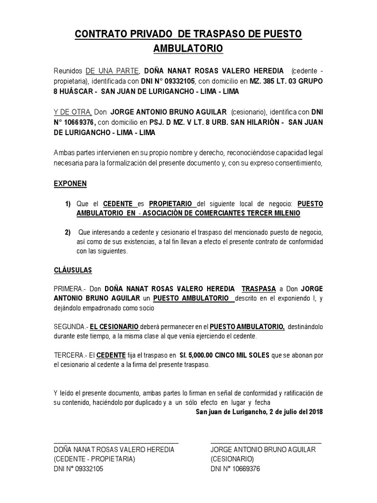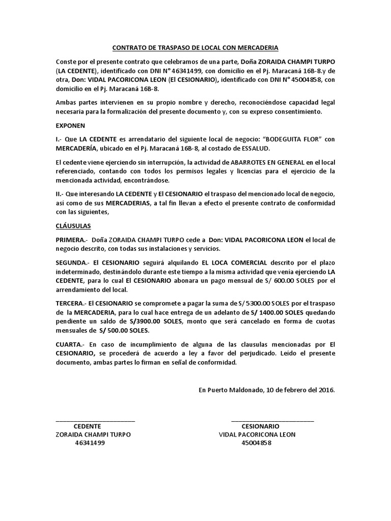 Contrato De Traspaso De Local Con Mercaderia Zoraida Champi