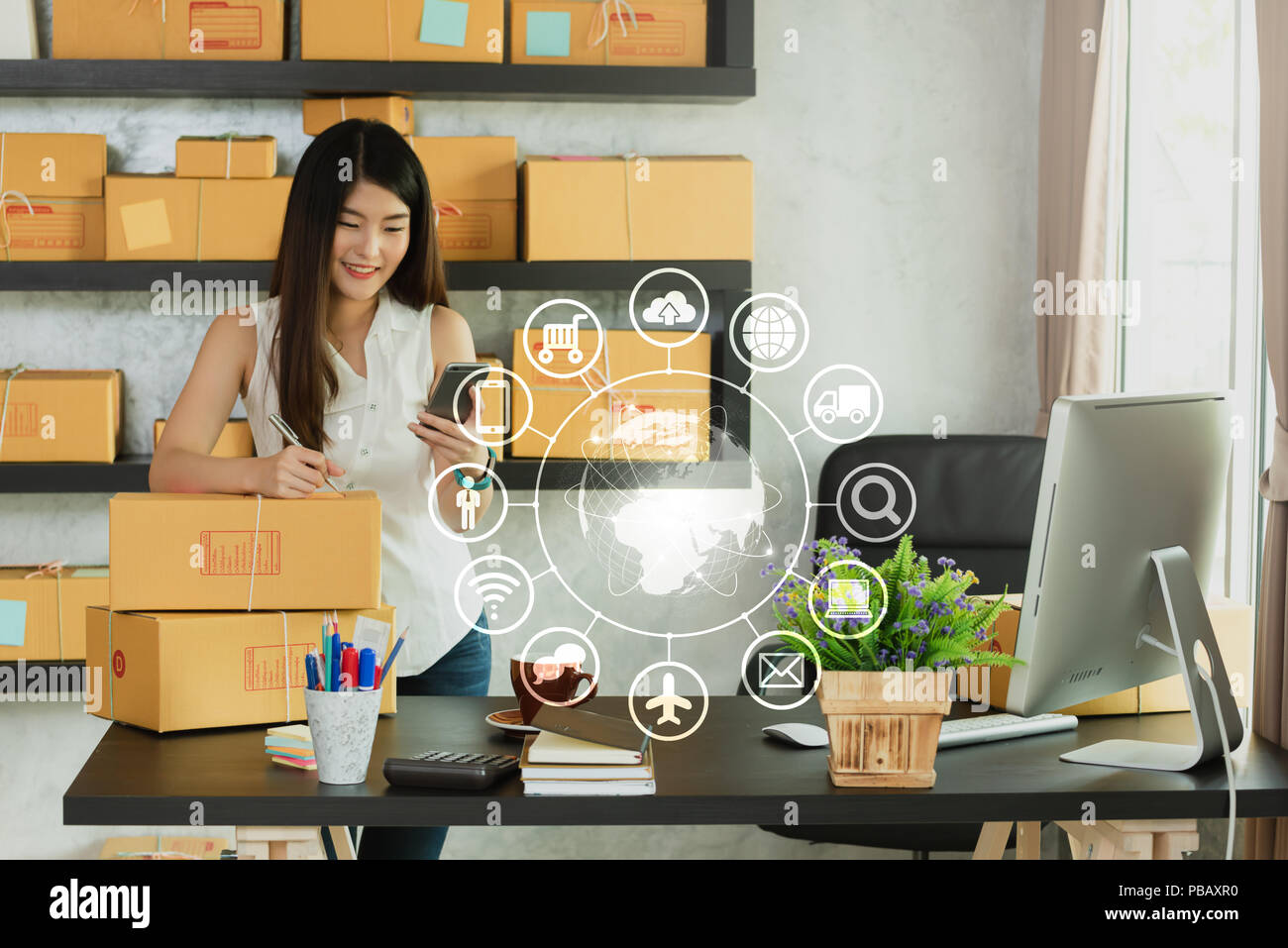 Mujer Emprendedor Con Cajas De Paquetes En Su Propio Negocio De